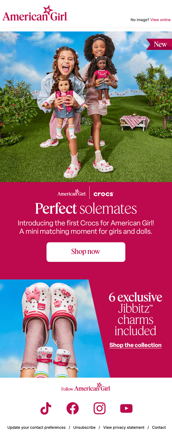 When American Girl teamed up with Crocs to create the first-ever Crocs for dolls, we needed a big campaign to celebrate this mini-matching moment! This whimsically fun photo campaign created a larger-than life brand collab statement used across print, retail, digital and social channels for both AG and Crocs.